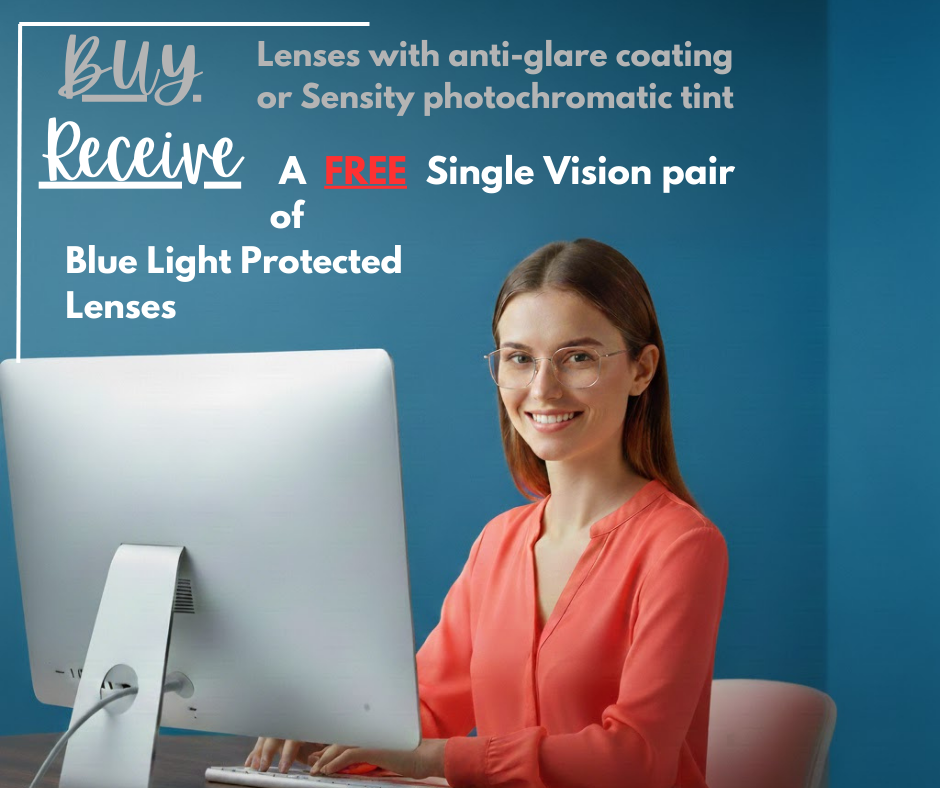 RECEIVE – A FREE SECOND PAIR OF SINGLE VISION BLUE LIGHT PROTECTED STOCK LENSES or SUNGLASS LENSES.